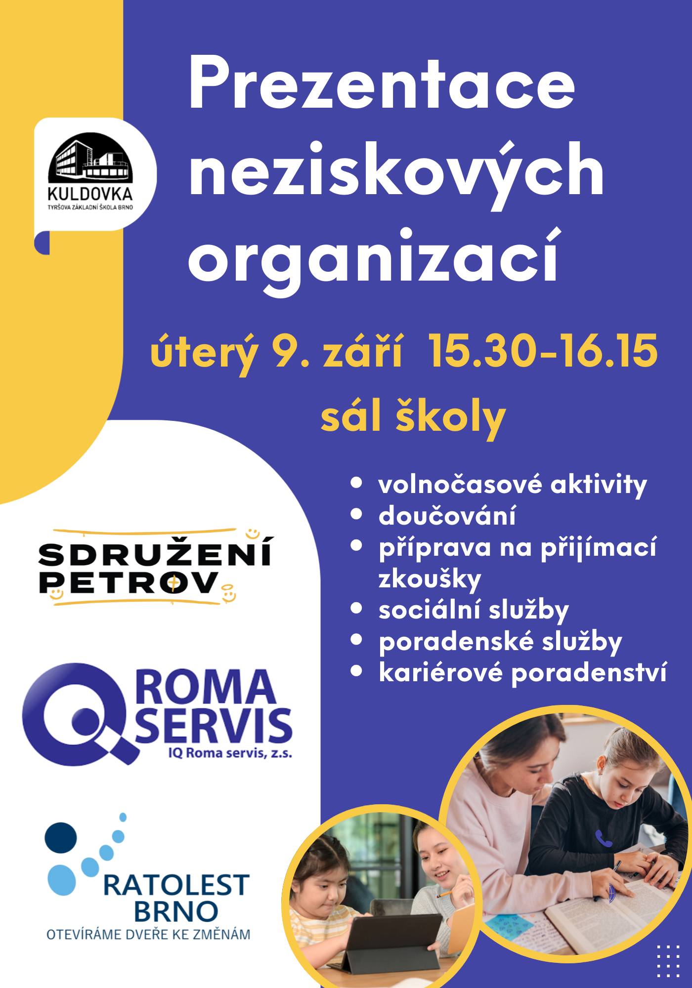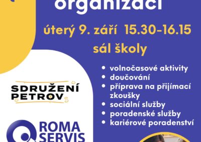 Ještě než v úterý 9. 9. vyrazíte na třídní schůzky, zavítejte určitě do školního sálu, kde kromě prezentace nabízených volnočasových kroužků proběhne poprvé také prezentace neziskových organizací, s nimiž budeme v letošním školním roce úzce spolupracovat.