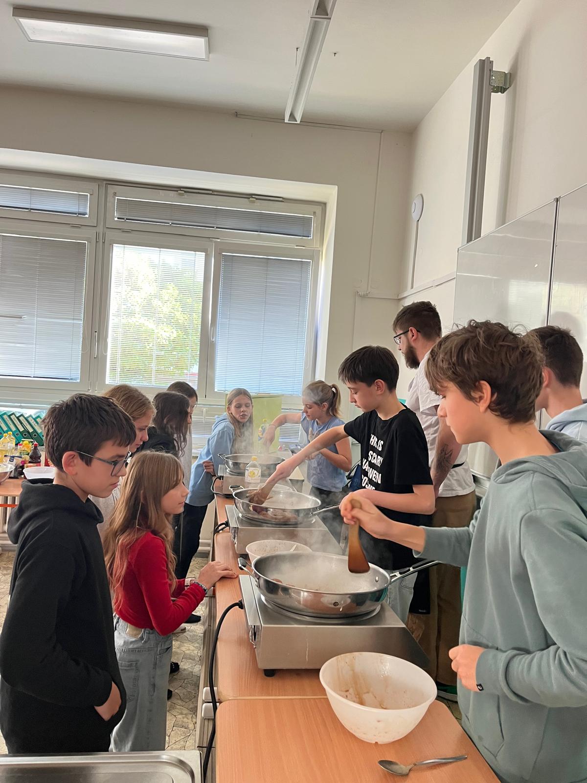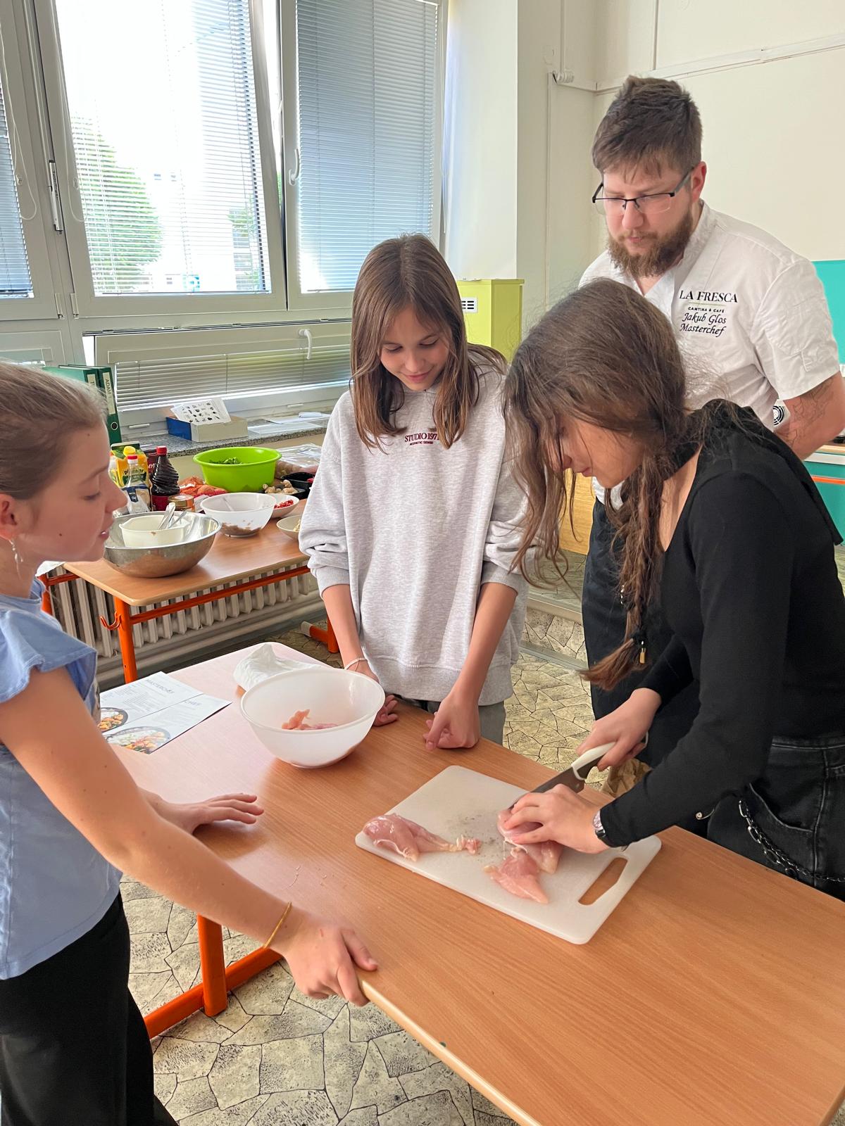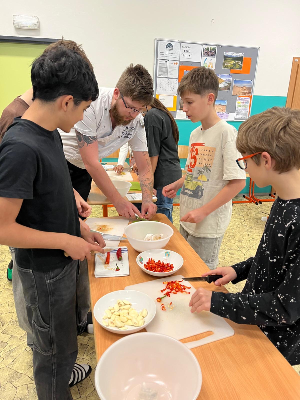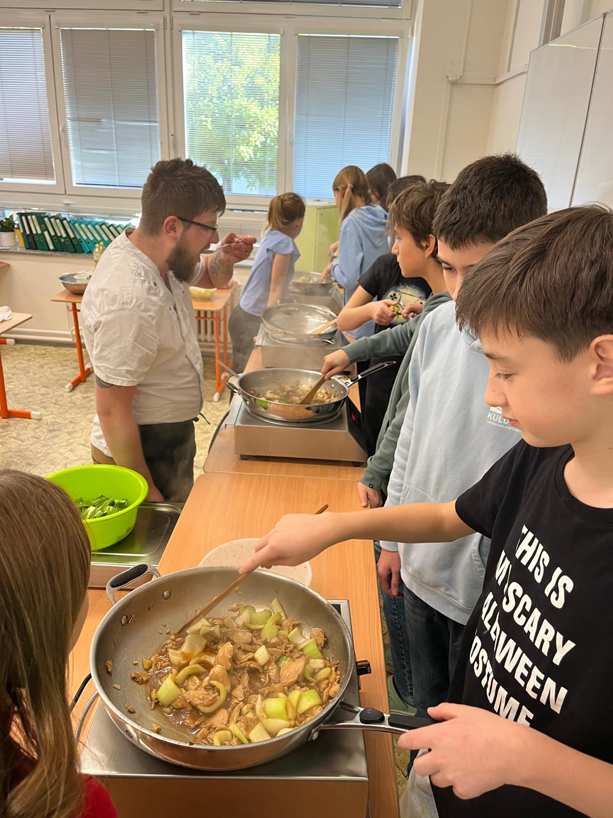 Vaříme s masterchefem autor: Jiří Bachroň | 18.11.2025 | Aktuality, Fotogalerie 2025/2026 Takhle to vypadá, když se školní třída změní v kuchyni. Sedmáci se zúčastnili výukového programu Vaříme s masterchefem a pod vedením kuchaře Jakuba Glose si vyzkoušeli uvařit kuře na pomerančích a asijské speciality.