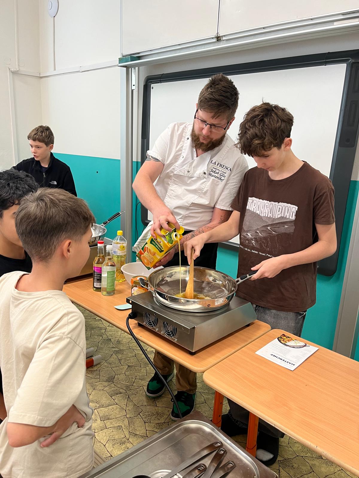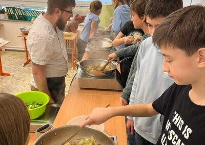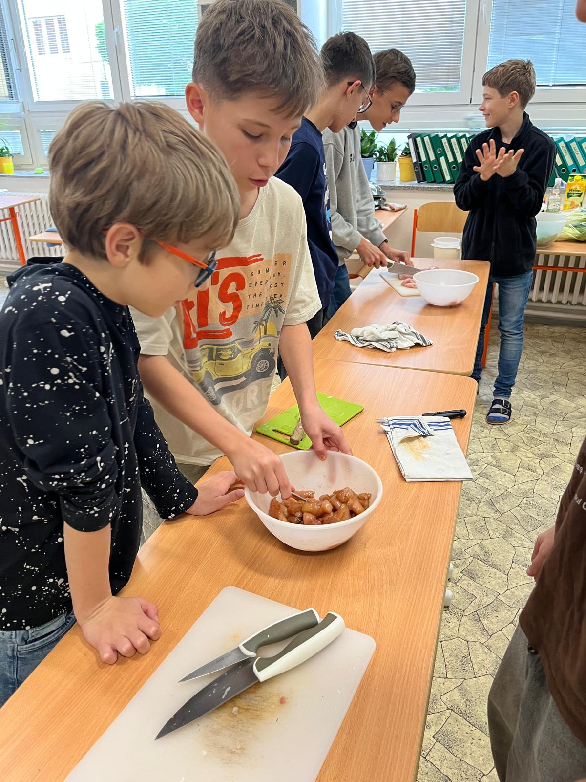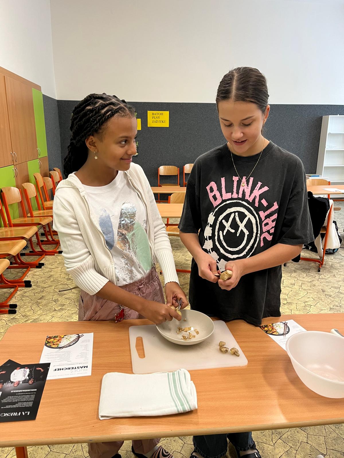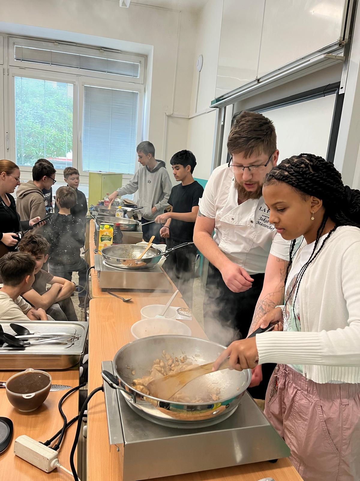 Vaříme s masterchefem autor: Jiří Bachroň | 18.11.2025 | Aktuality, Fotogalerie 2025/2026 Takhle to vypadá, když se školní třída změní v kuchyni. Sedmáci se zúčastnili výukového programu Vaříme s masterchefem a pod vedením kuchaře Jakuba Glose si vyzkoušeli uvařit kuře na pomerančích a asijské speciality.
