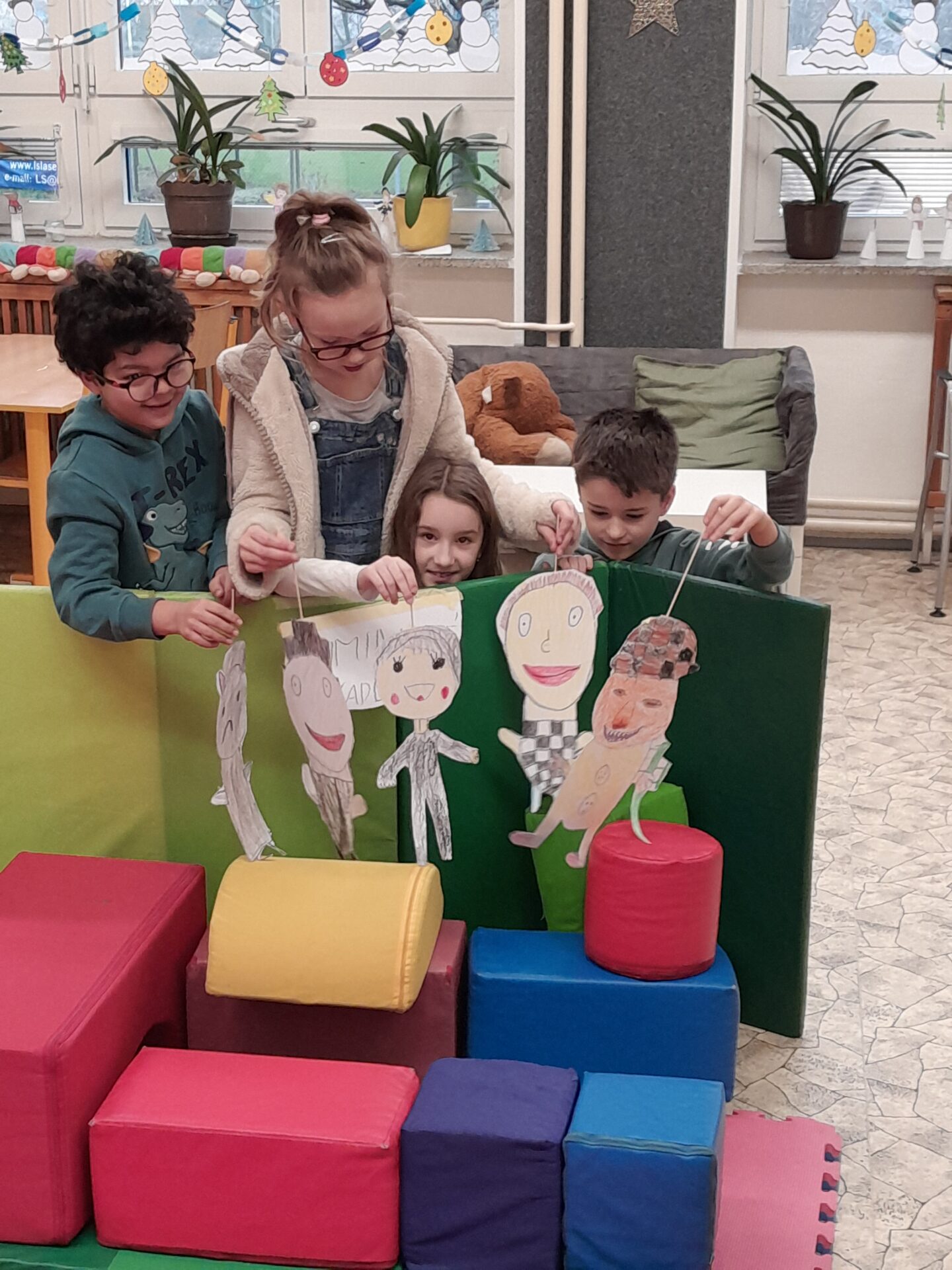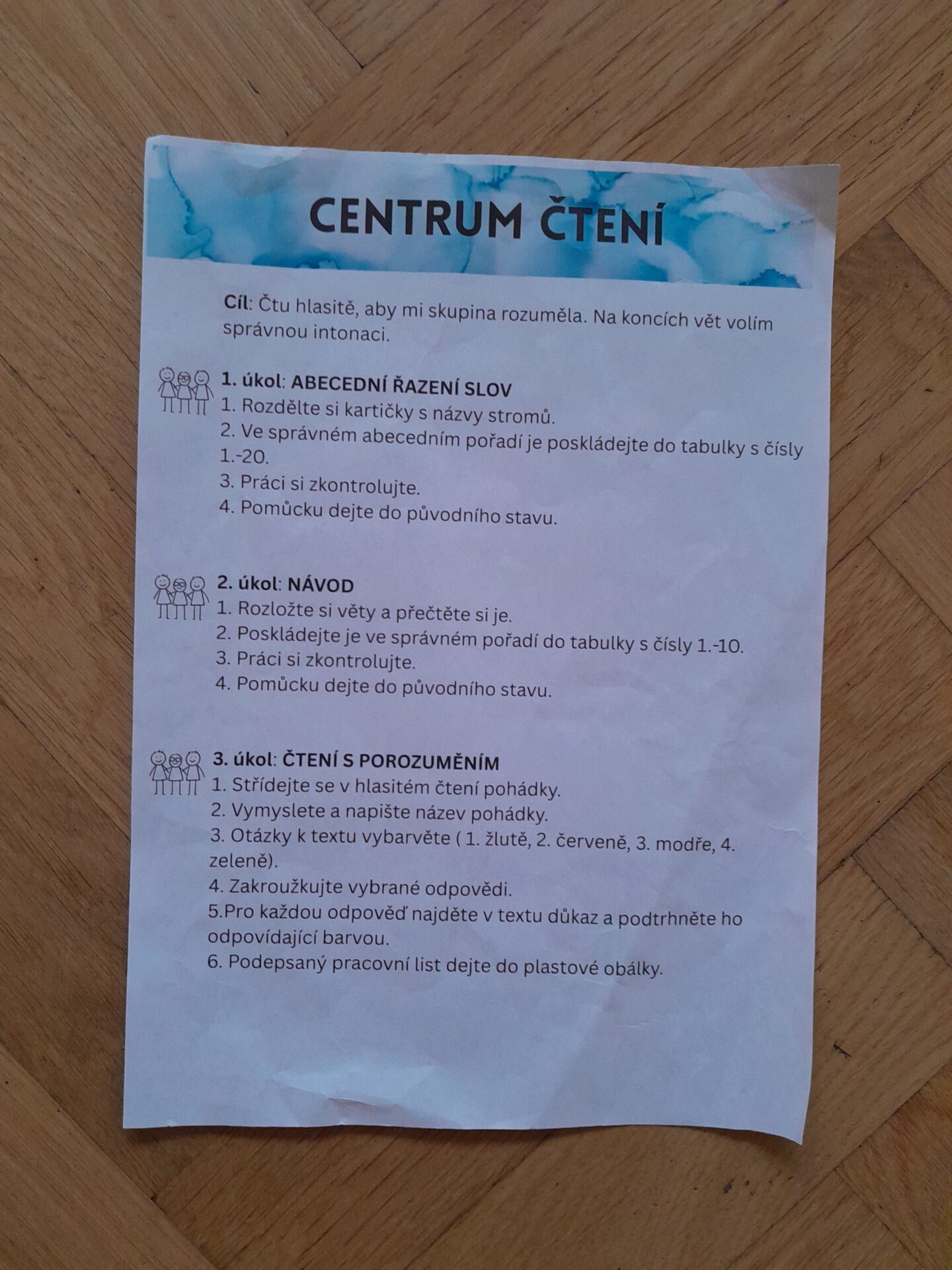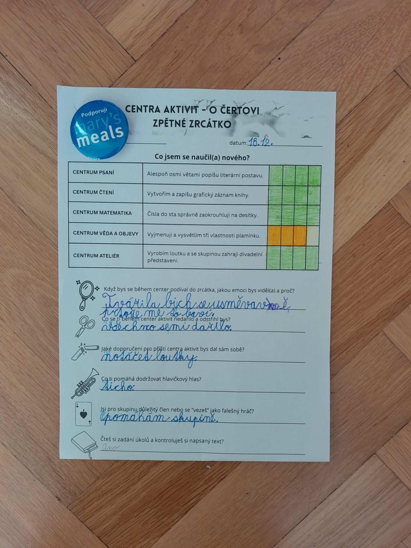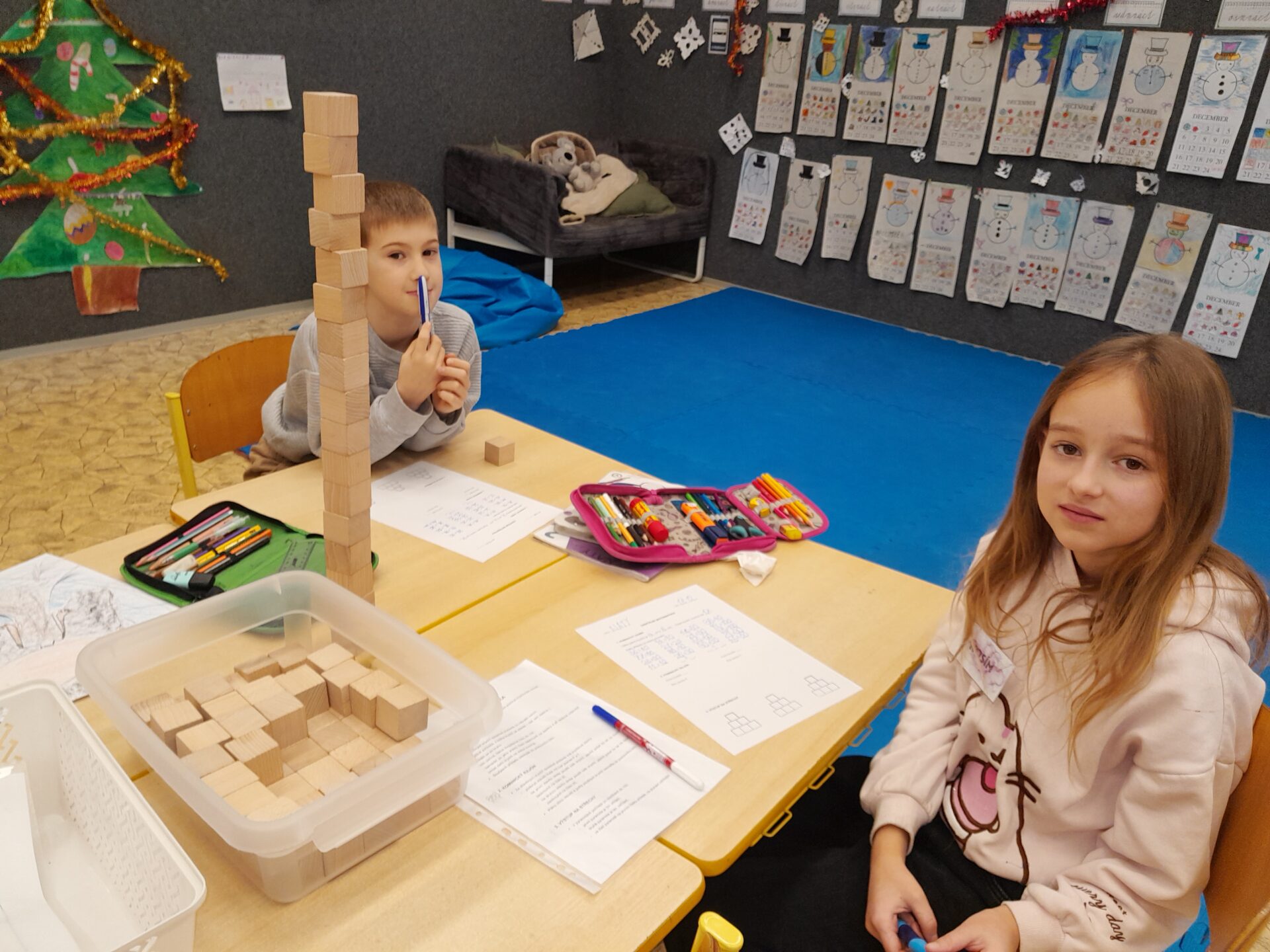 Děti jsou rozděleny do pěti skupin, během týdne v nich postupně projdou Centrem čtení, Centrem psaní, Centrem matematika, Centrem věda a objevy, Centrem ateliér. Začínáme na společném kruhu, kde zaznívají již zmíněná doporučení a zásadní myšlenky z předchozího dne. Následně se skupiny rozejdou do Center, kde si děti rozdělí role (tiším, podporuji, nosím, prezentuji) a samostatně si přečtou cíl a zadání jednotlivých úkolů. V boxu mají všechny potřebné pomůcky, pracovní listy i Zpětné zrcátko k průběžné reflexi a sebehodnocení. V závěru výuky se opět setkáváme na hodnotícím kruhu, kde jednotlivé skupiny prezentují a reflektují svoji práci. Slova jako oceňuji či doporučuji jsou pro druhÁčata běžnými, stejně jako schopnost zaznamenat si vlastní sebehodnocení, reflektovat daný cíl a naplnění své aktuální role. Za to, co osmileté děti dokážou, vděčíme i formativnímu hodnocení. Vybrané fotky jsou z podzimních Center Listy a vánočních O čertovi. Příběh Pavla Čecha nám dojemně zarámoval třídní adventní čas.