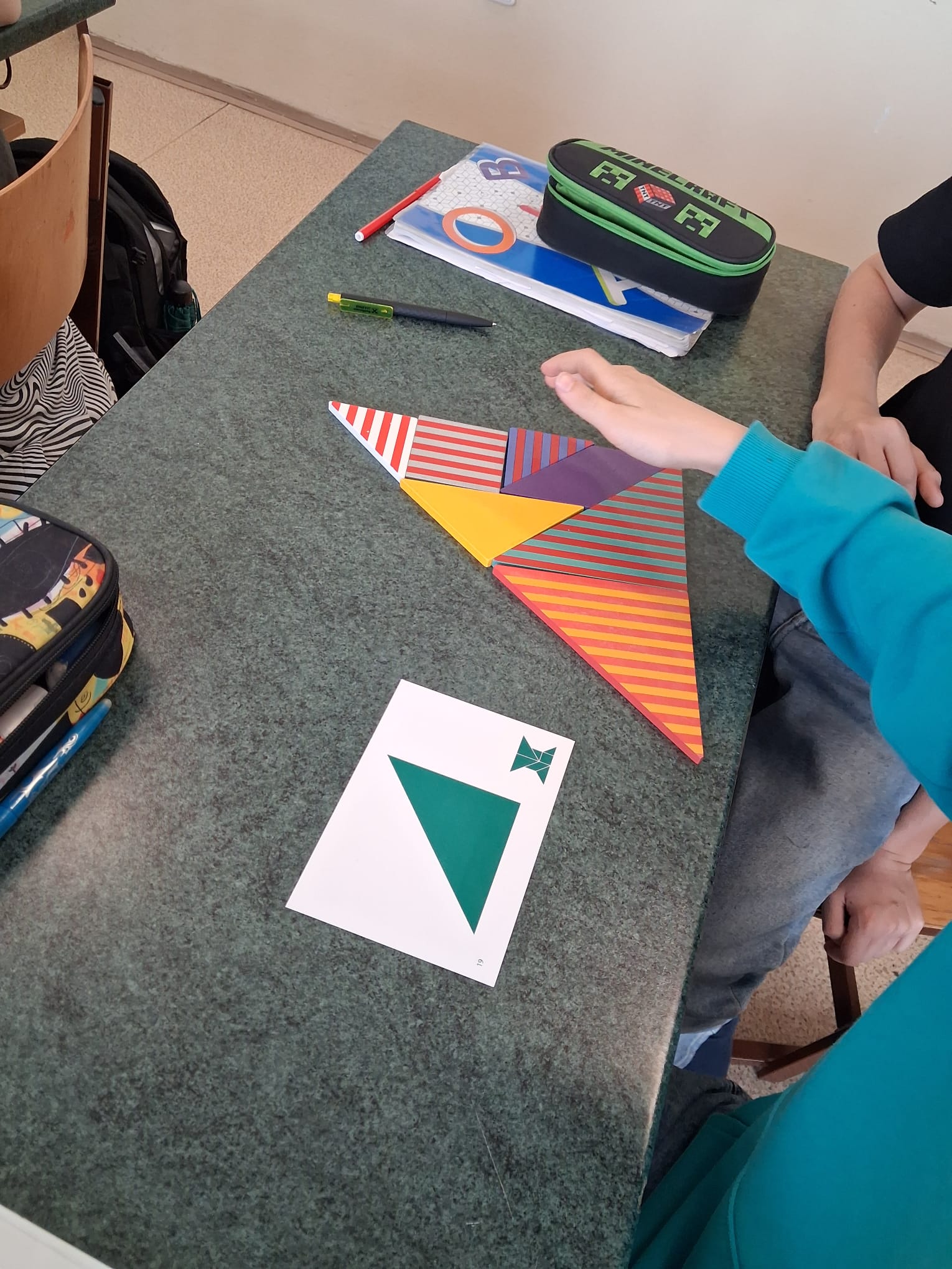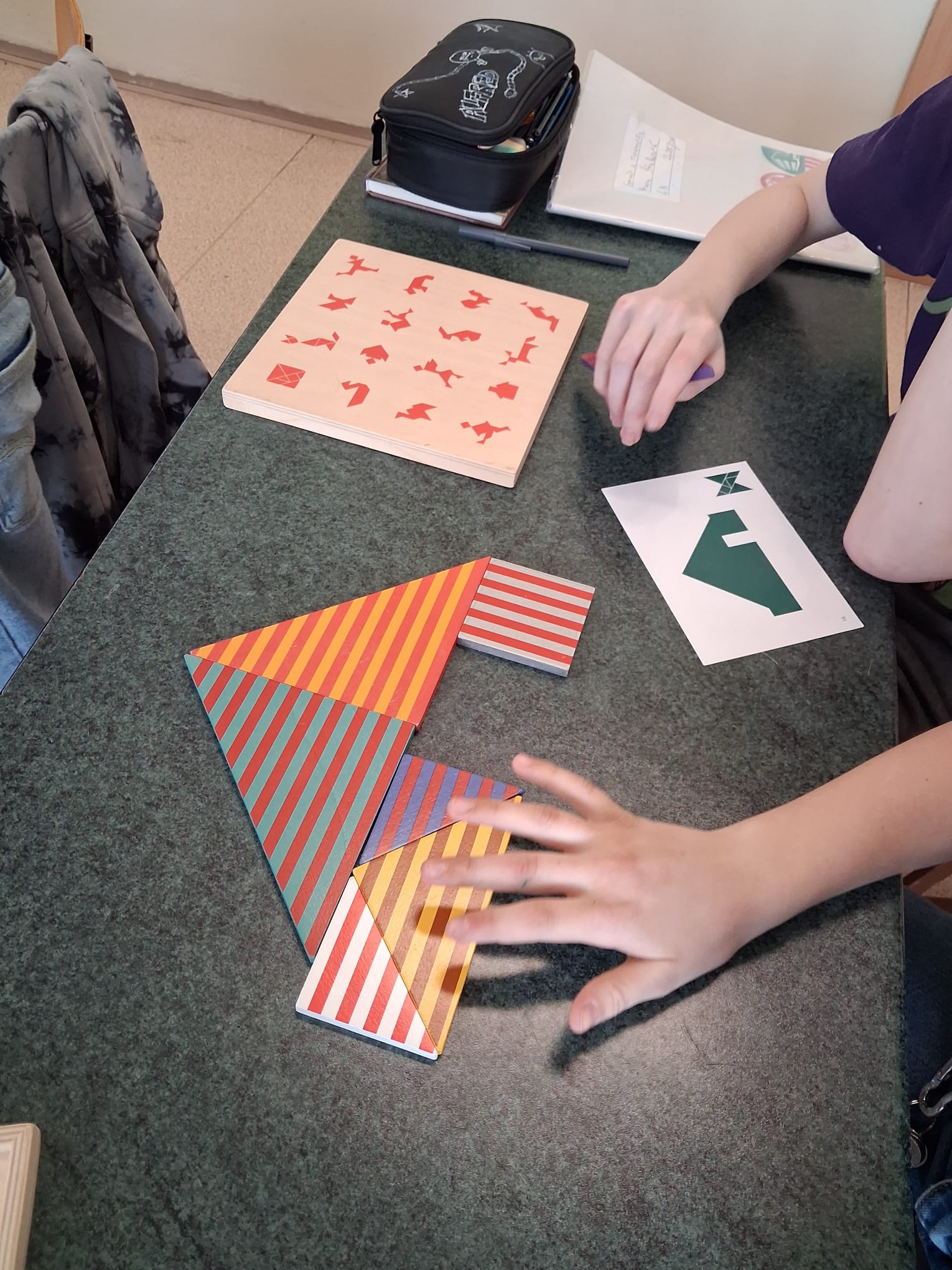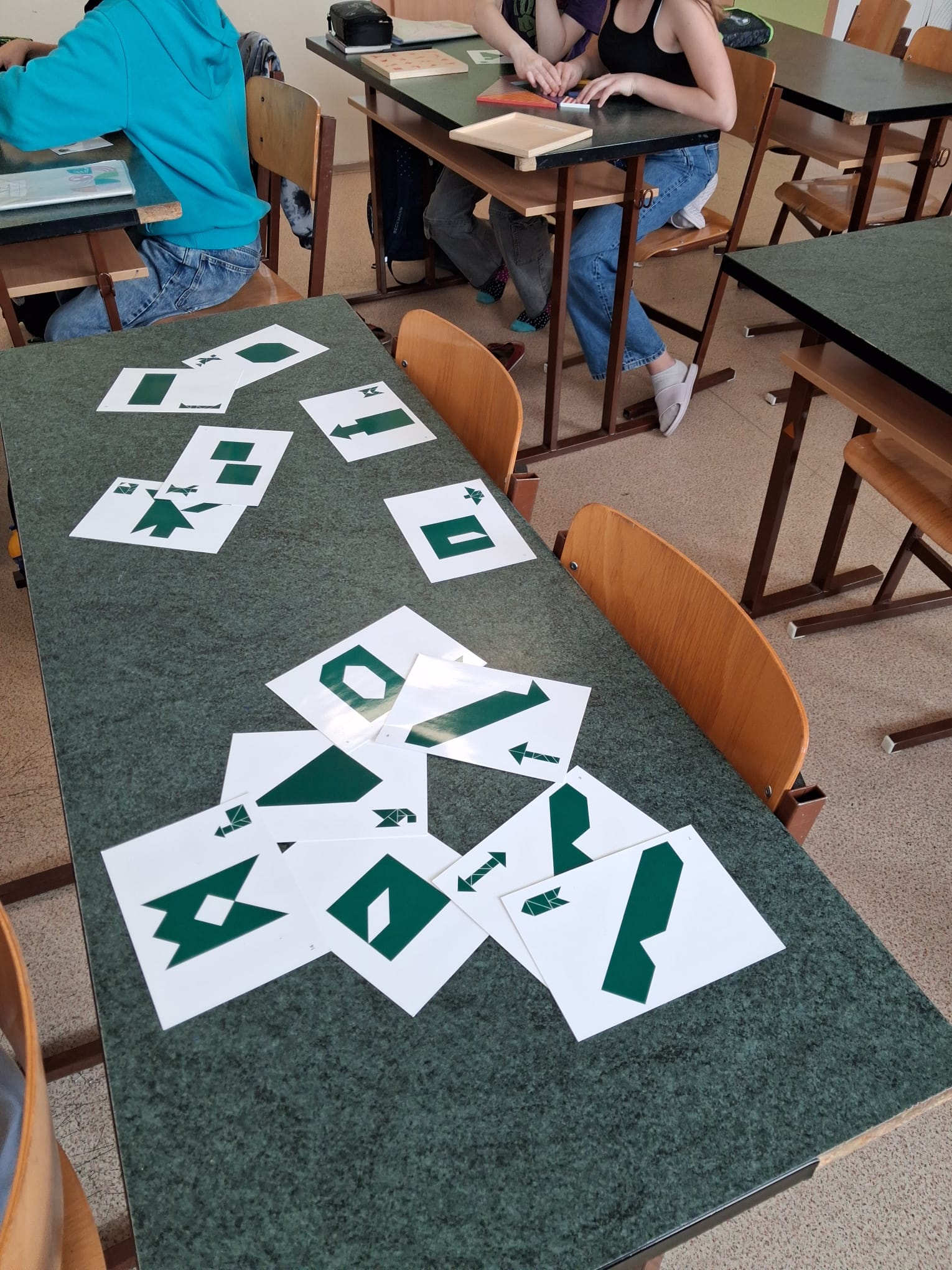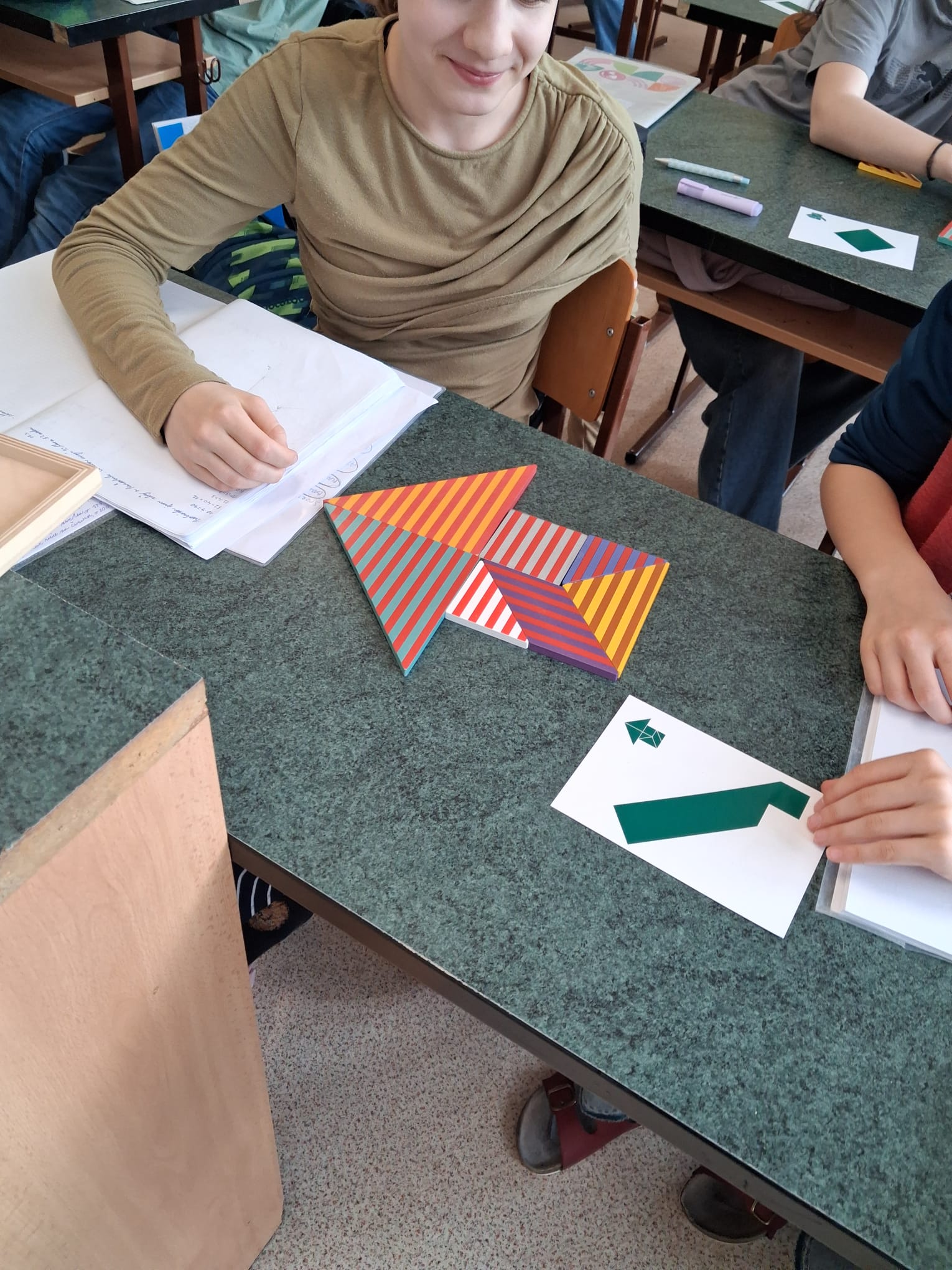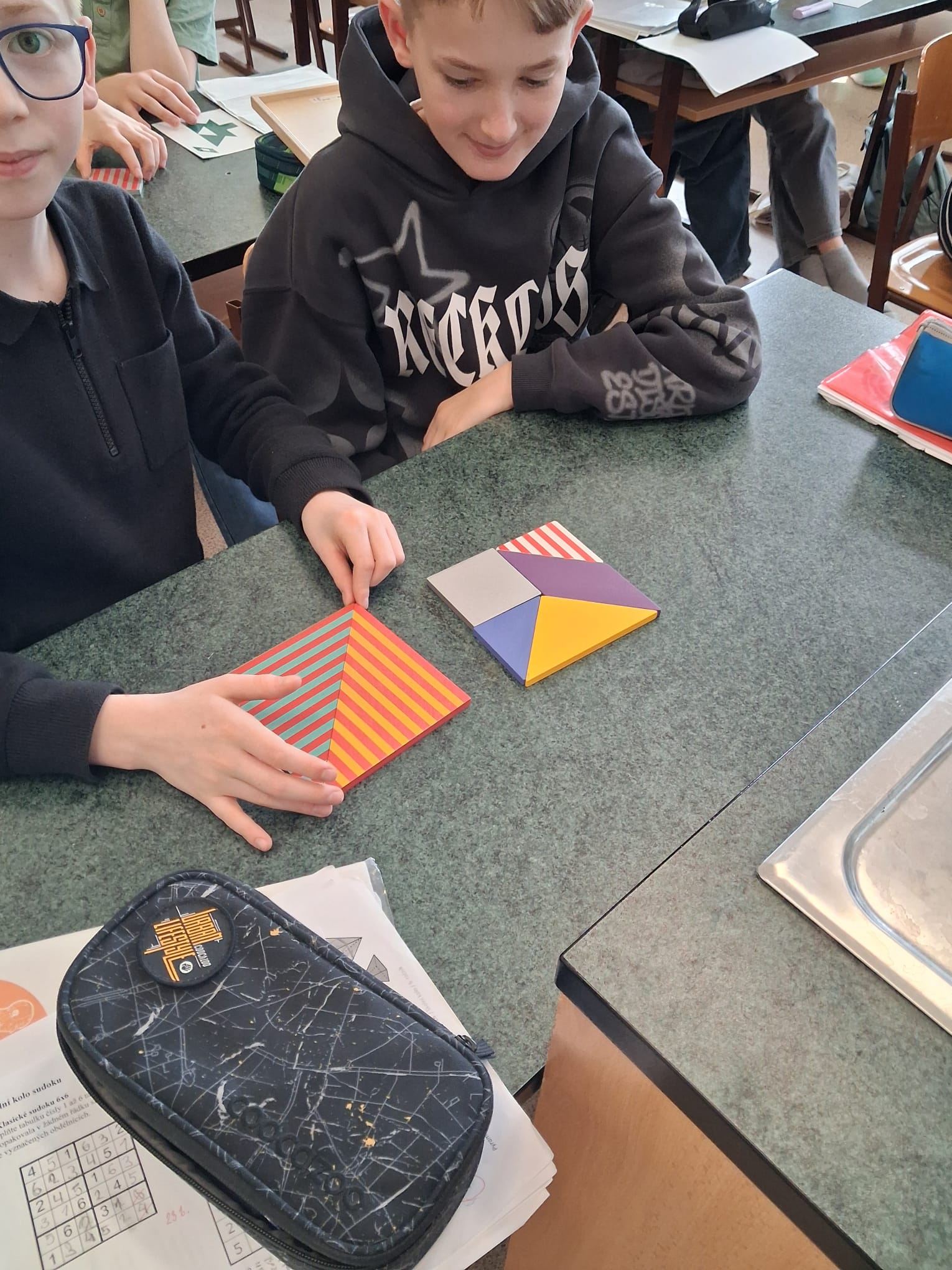 Práce s tangramy autor: Jiří Bachroň | 27.3.2026 | Aktuality, Fotogalerie 2025/2026 Nedávná hodina semináře z matematiky v 6. B a práce s tangramy. Ačkoliv někteří žáci viděli tento slavný hlavolam sedmi dílků poprvé, skládání jim šlo docela dobře.