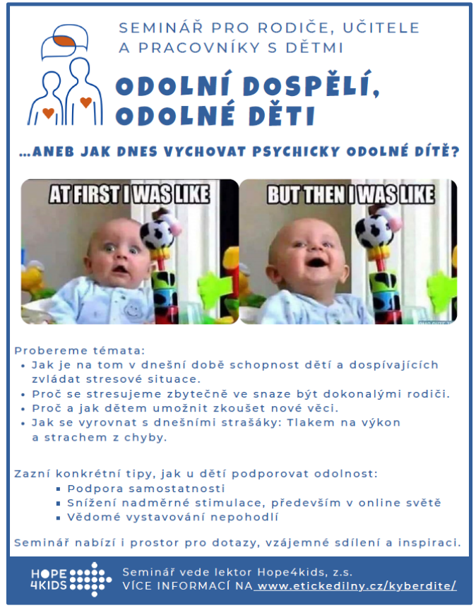 Proto bychom Vás rádi pozvali na seminář „Odolní dospělí, odolné dítě“, který povede externí lektor ze společnosti Hope4Kids.
